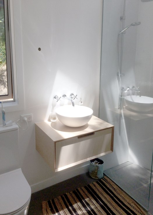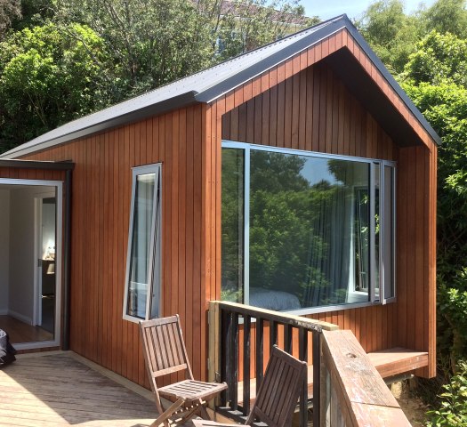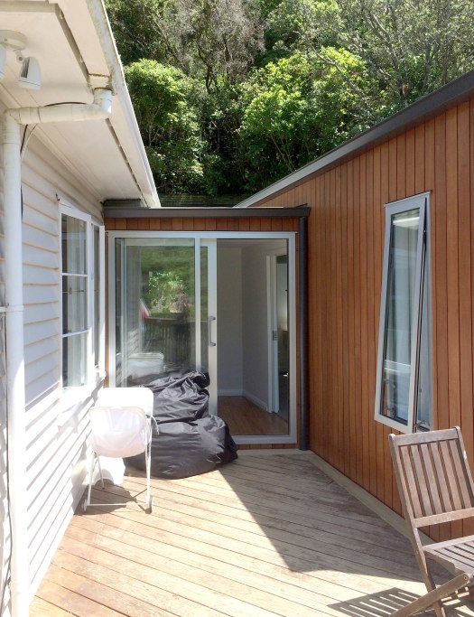 An existing 1940s weatherboard clad home has a short walk up to the main level, with a large north facing deck, open plan living room, dining and kitchen and 3 bedrooms. There is a single bathroom. Downstairs is a basement/rumpus room. The project involves the addition of a wing to the west side of the property, attached to the living room, which has a new master bedroom, ensuite and laundry. The addition is modern with vertical cedar weatherboards and aluminium windows. The scale responds to the existing house and a dynamic space is created between the structures by the two forms tilting away from each other.