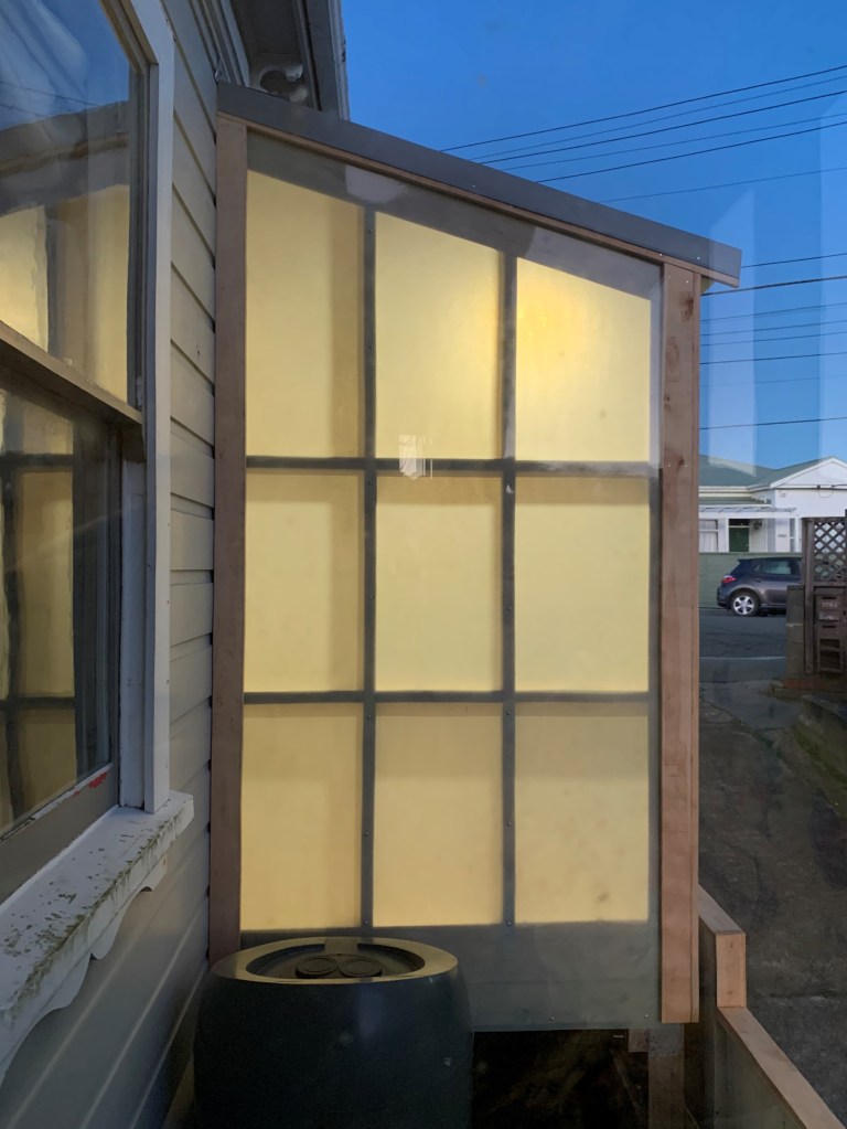 The translucent panels allow plenty of natural light in during the day while hiding the contents of the shed. The translucent form of the shed compliments the villa without dominating it.