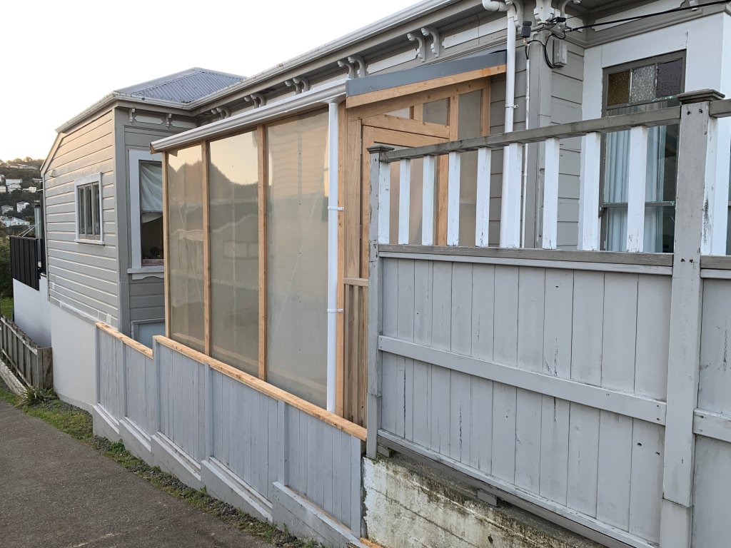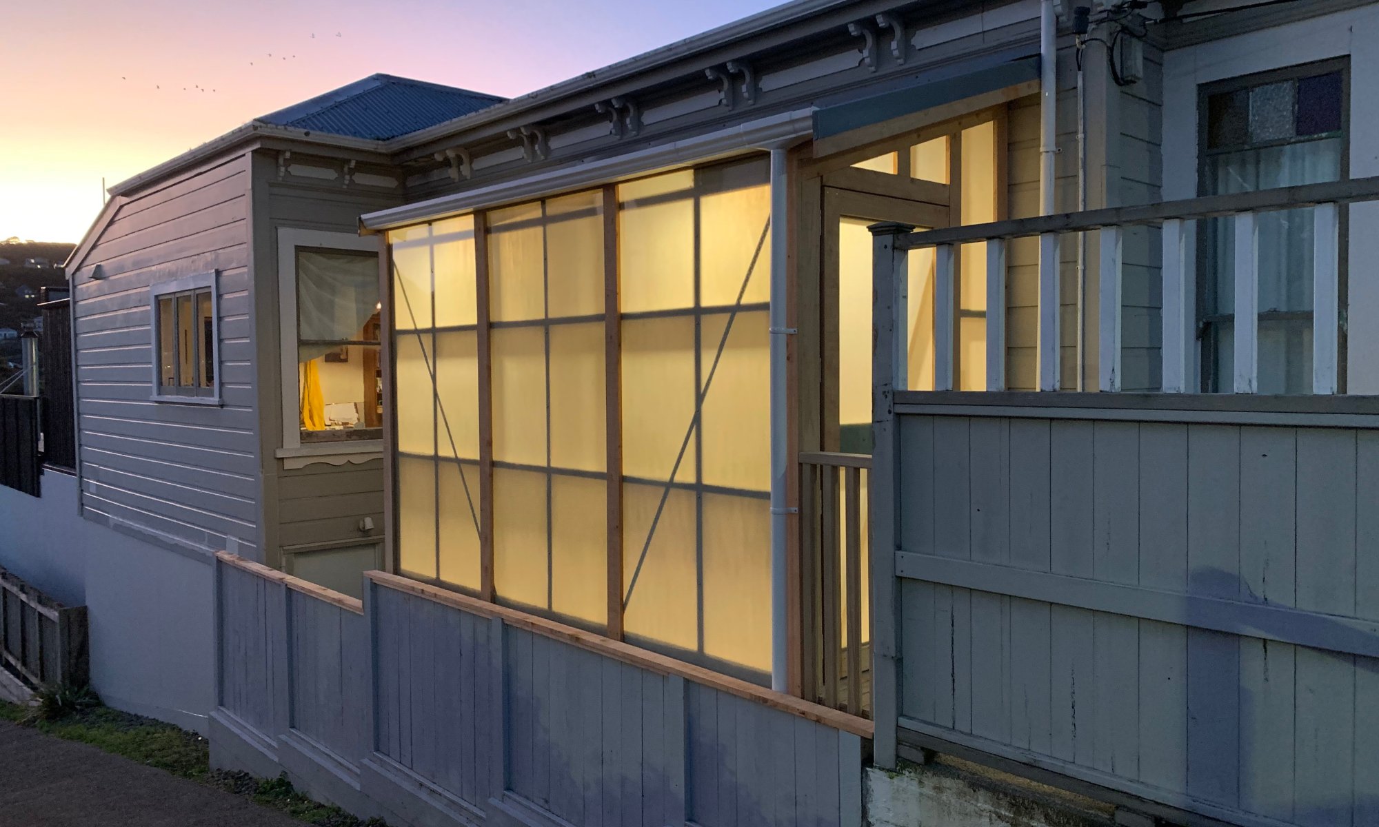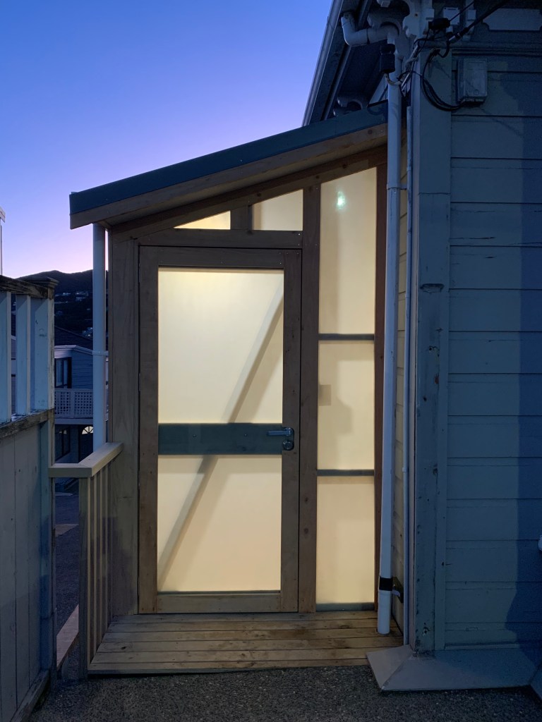 The walls of this simple structure are clad with translucent fibreglass sheets and covered with macrocarpa facing boards which will silver off over time.