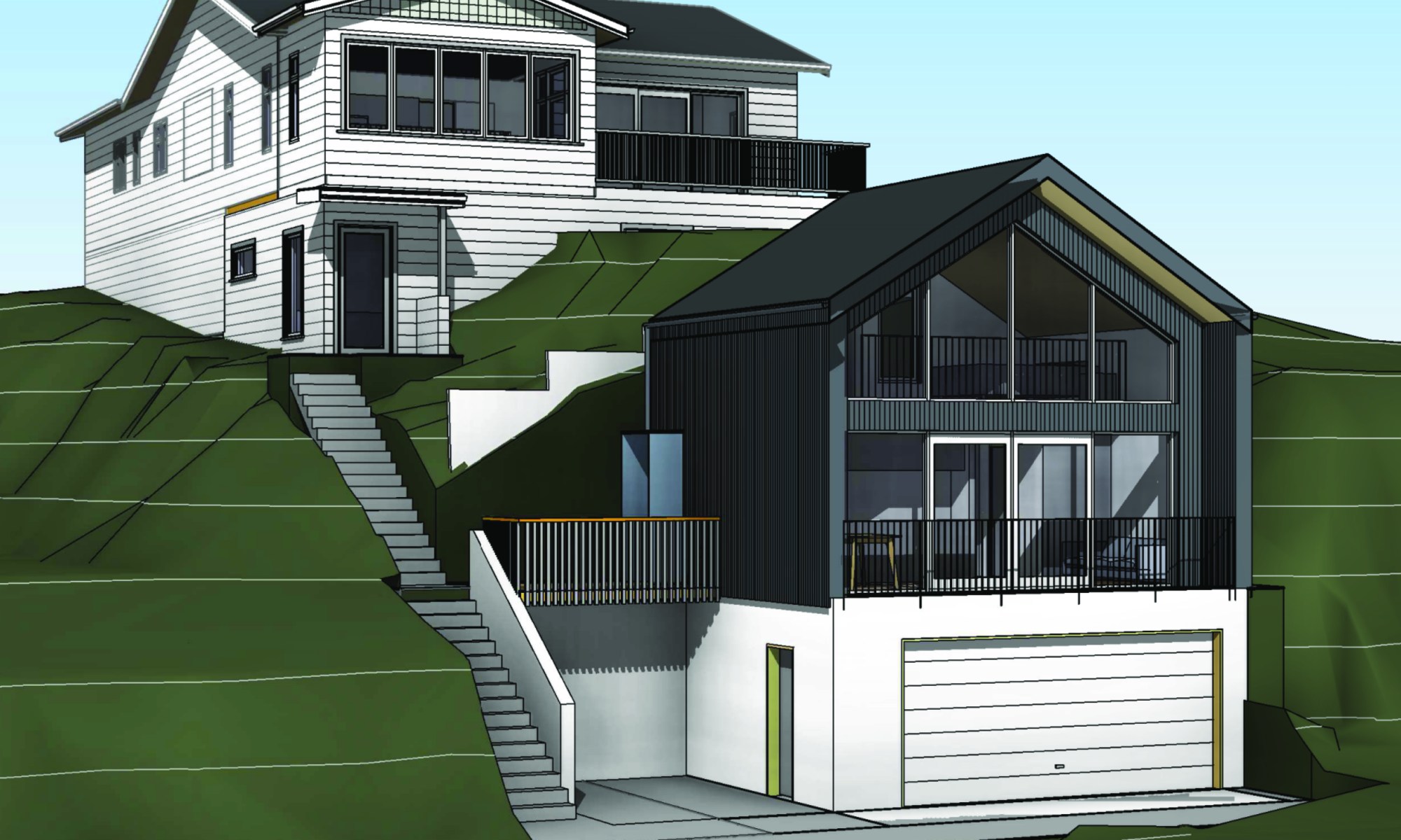 The new garage and unit will be modern and bold and complementary to the house above. It will be clad in profiled metal and have a soaring roofline.