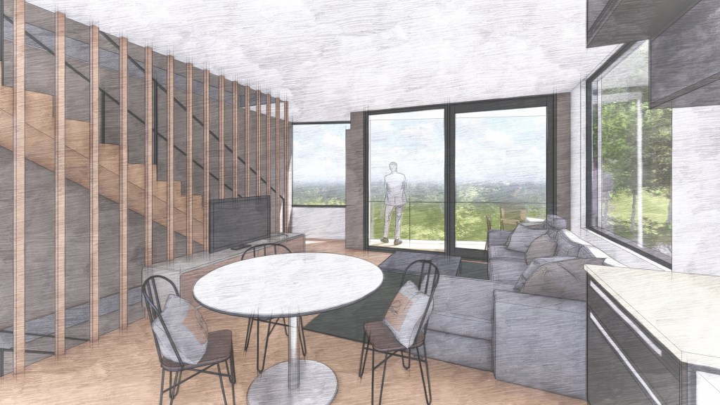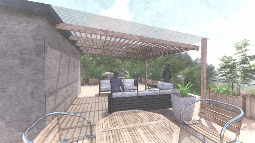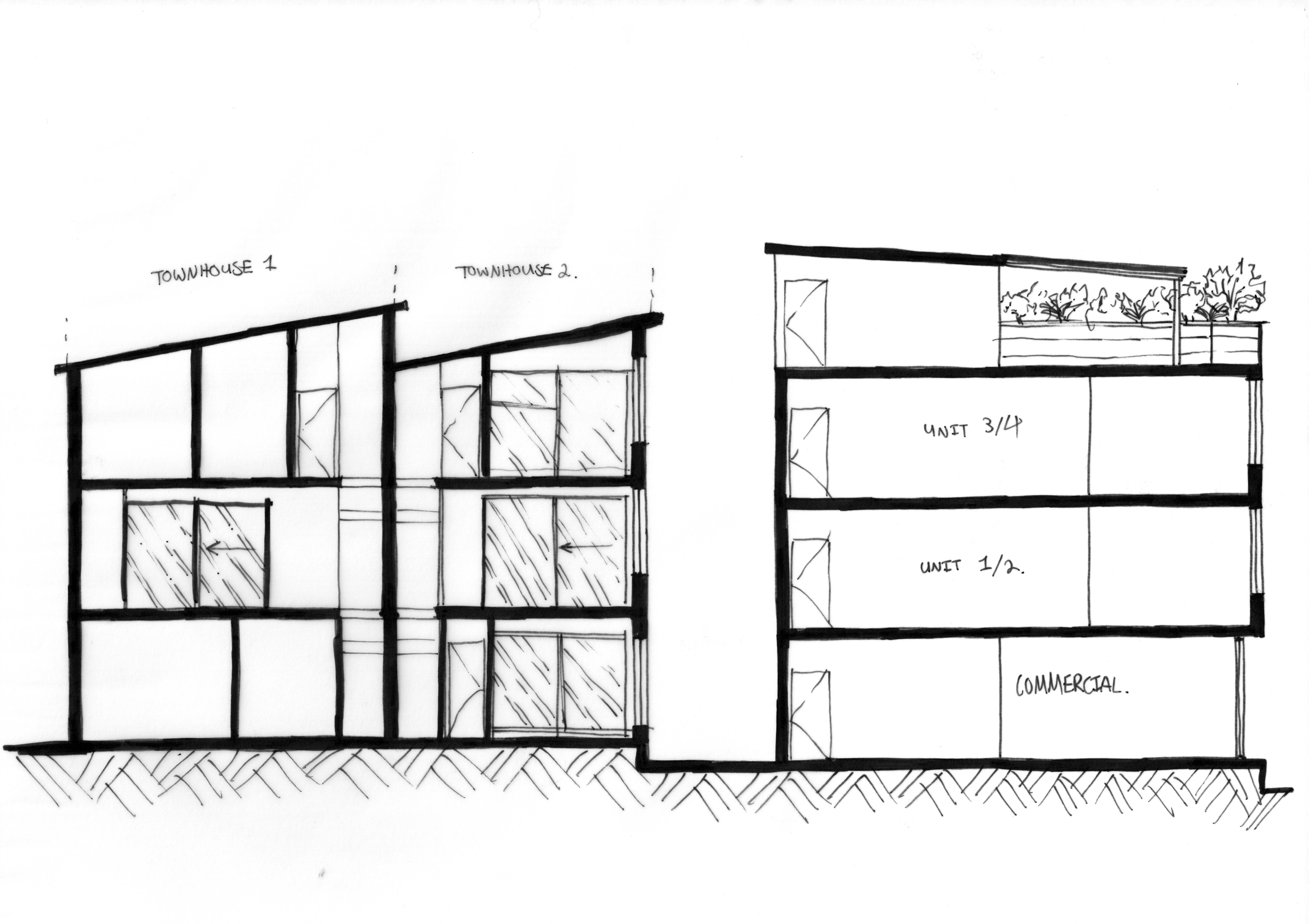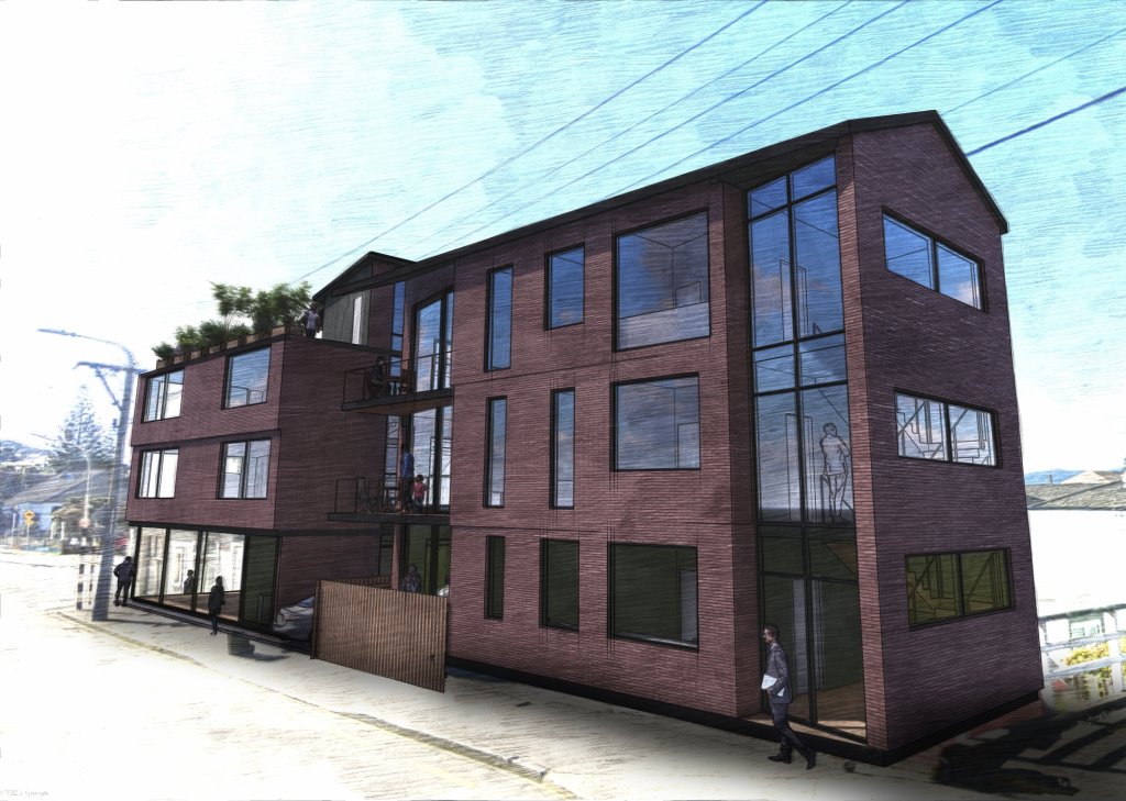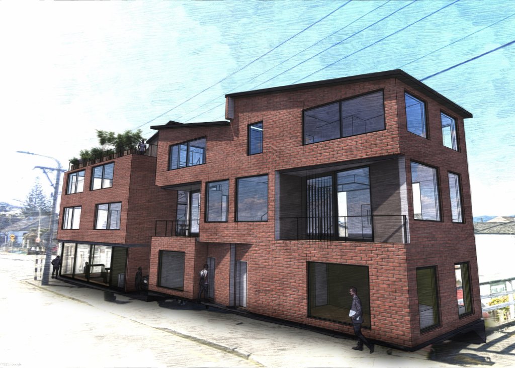 This small apartment building concept has a commercial space on the ground floor, four apartments, two large townhouses, and an outdoor roof space for the tenants of the apartments. The site is located close to the Kilbirnie Town Centre.