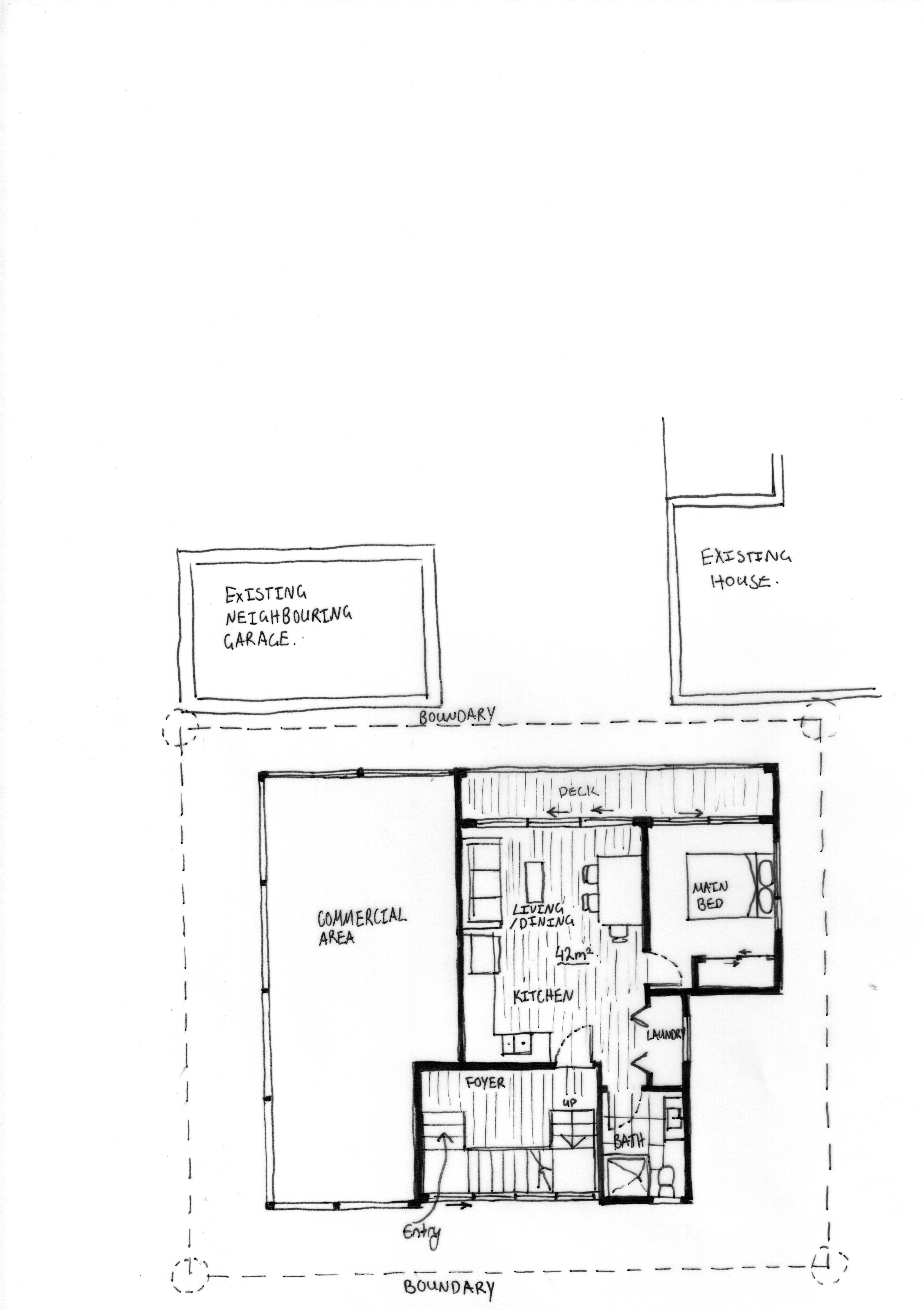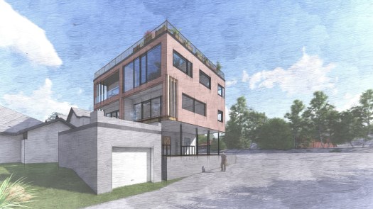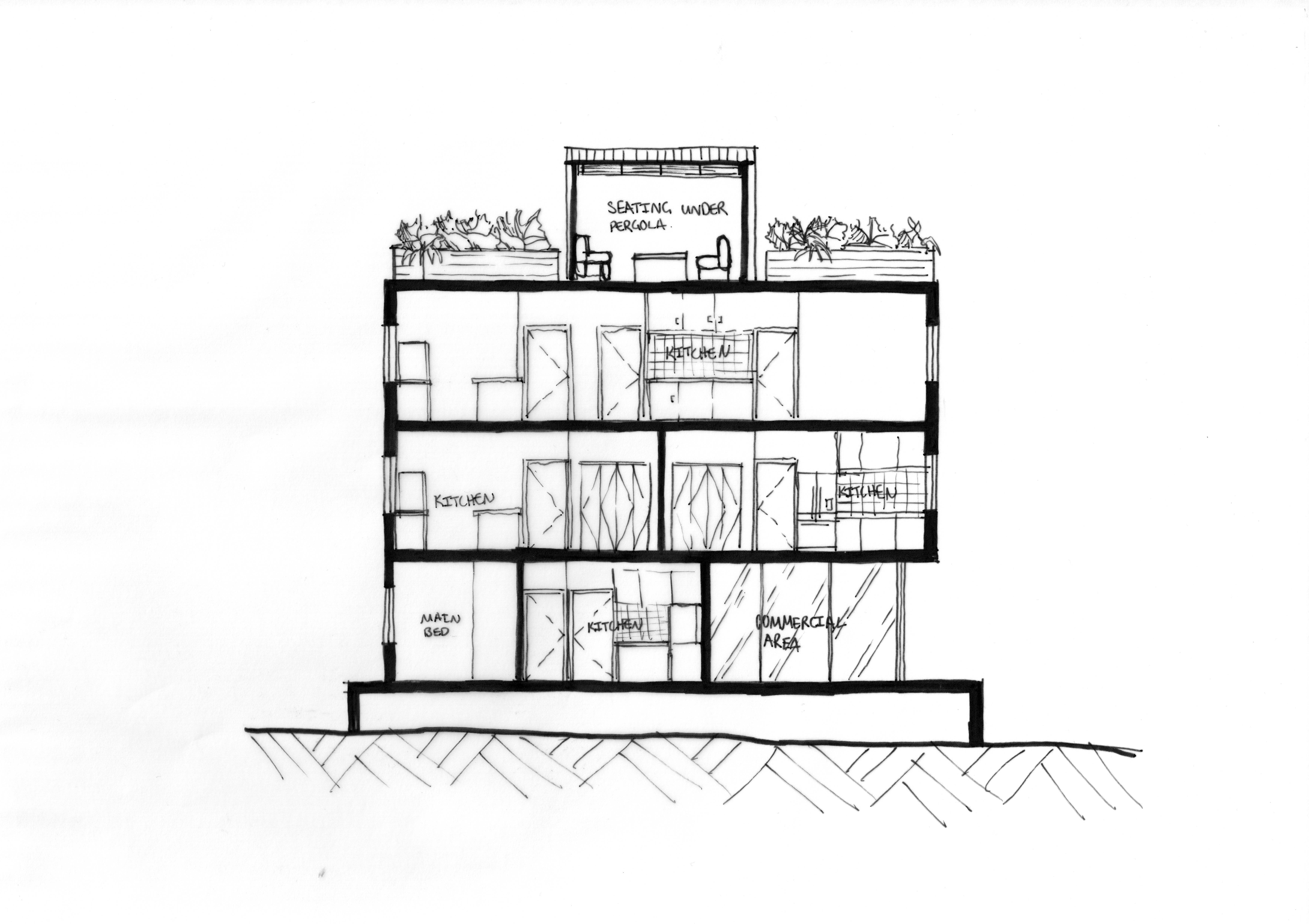 This small apartment building concept has a commercial space on the ground floor, four apartments, and a shared outdoor roof space for the tenants of the building. The site is located in a flood zone so the building sits on an elevated plinth to make it more resilient.