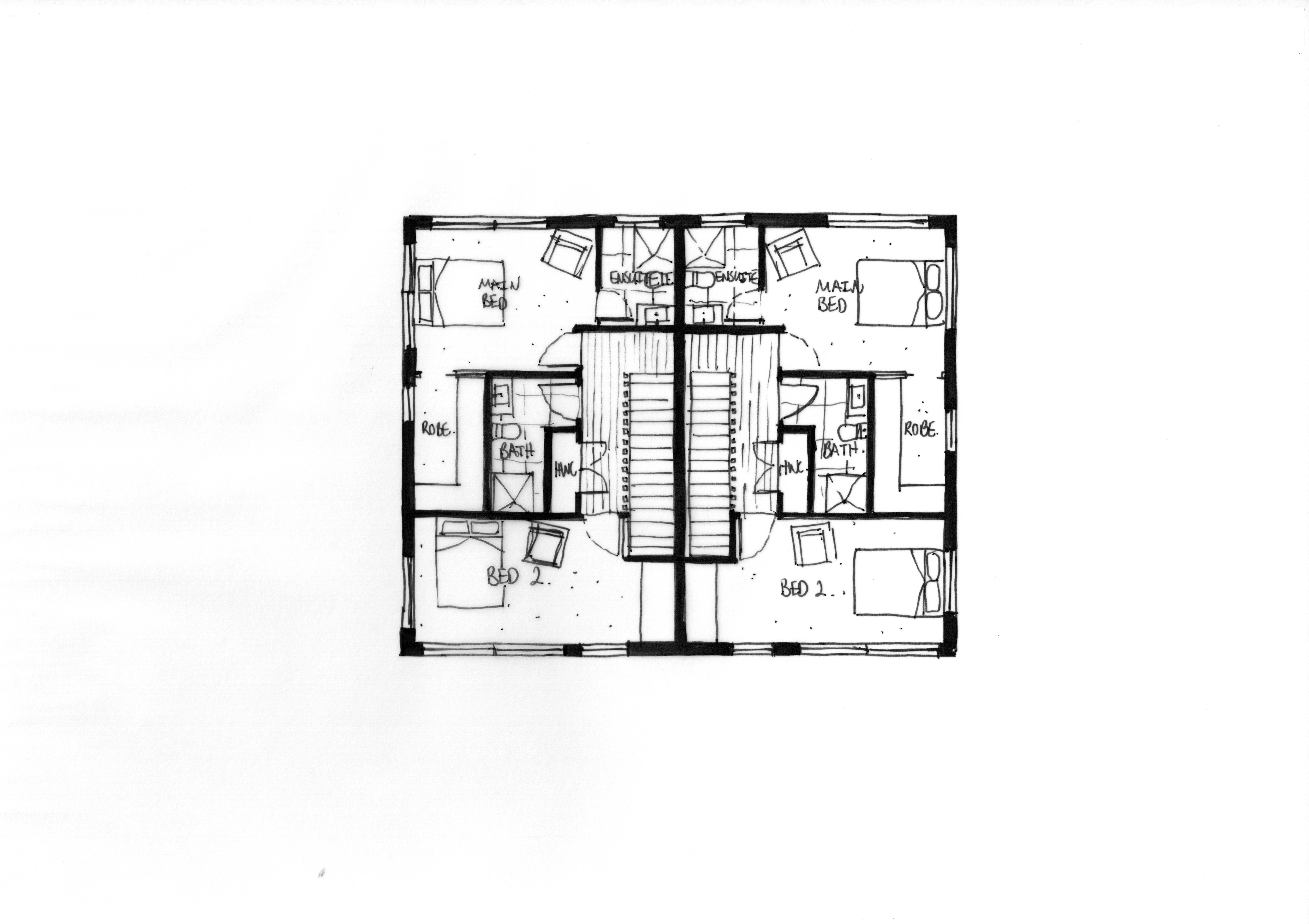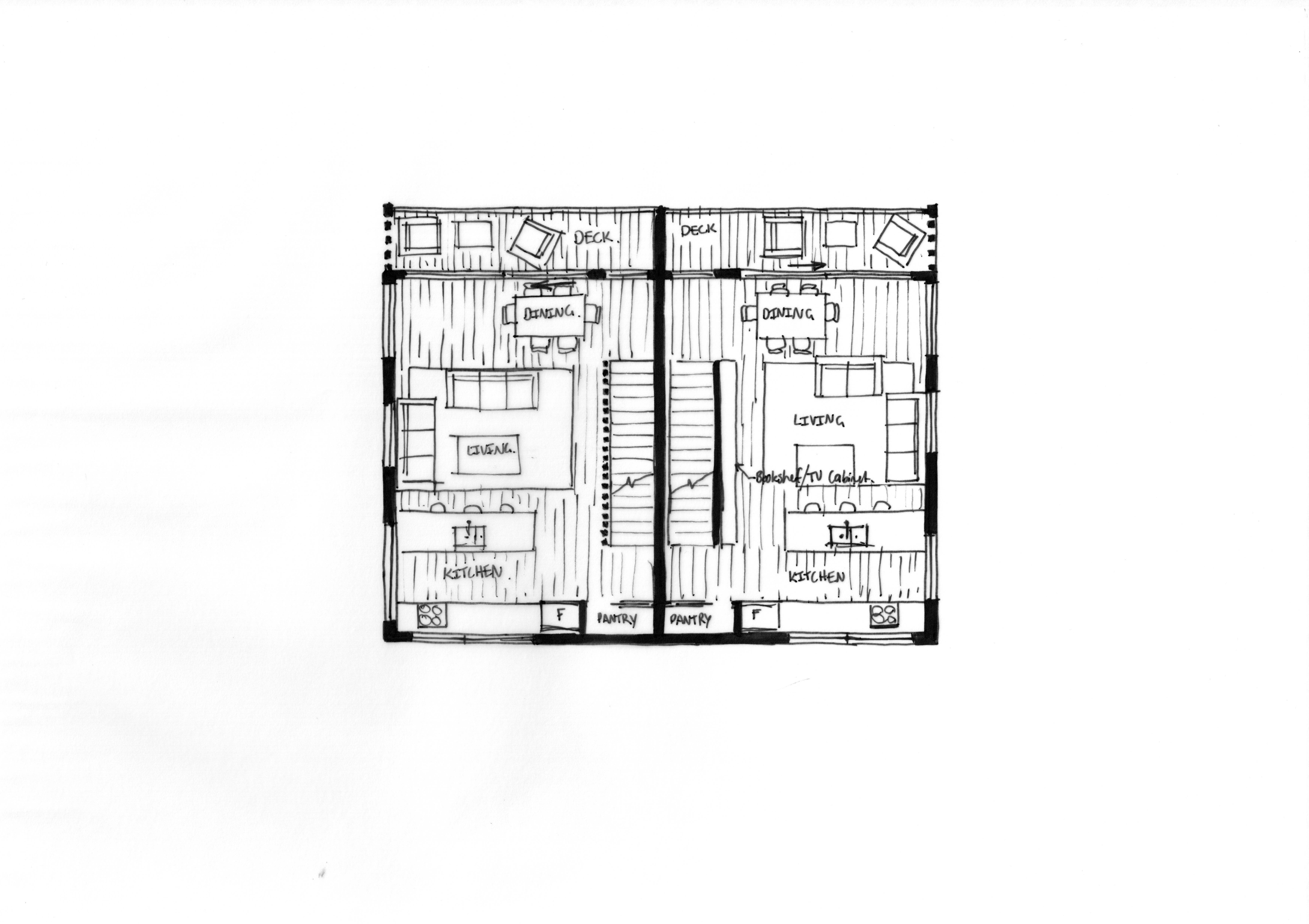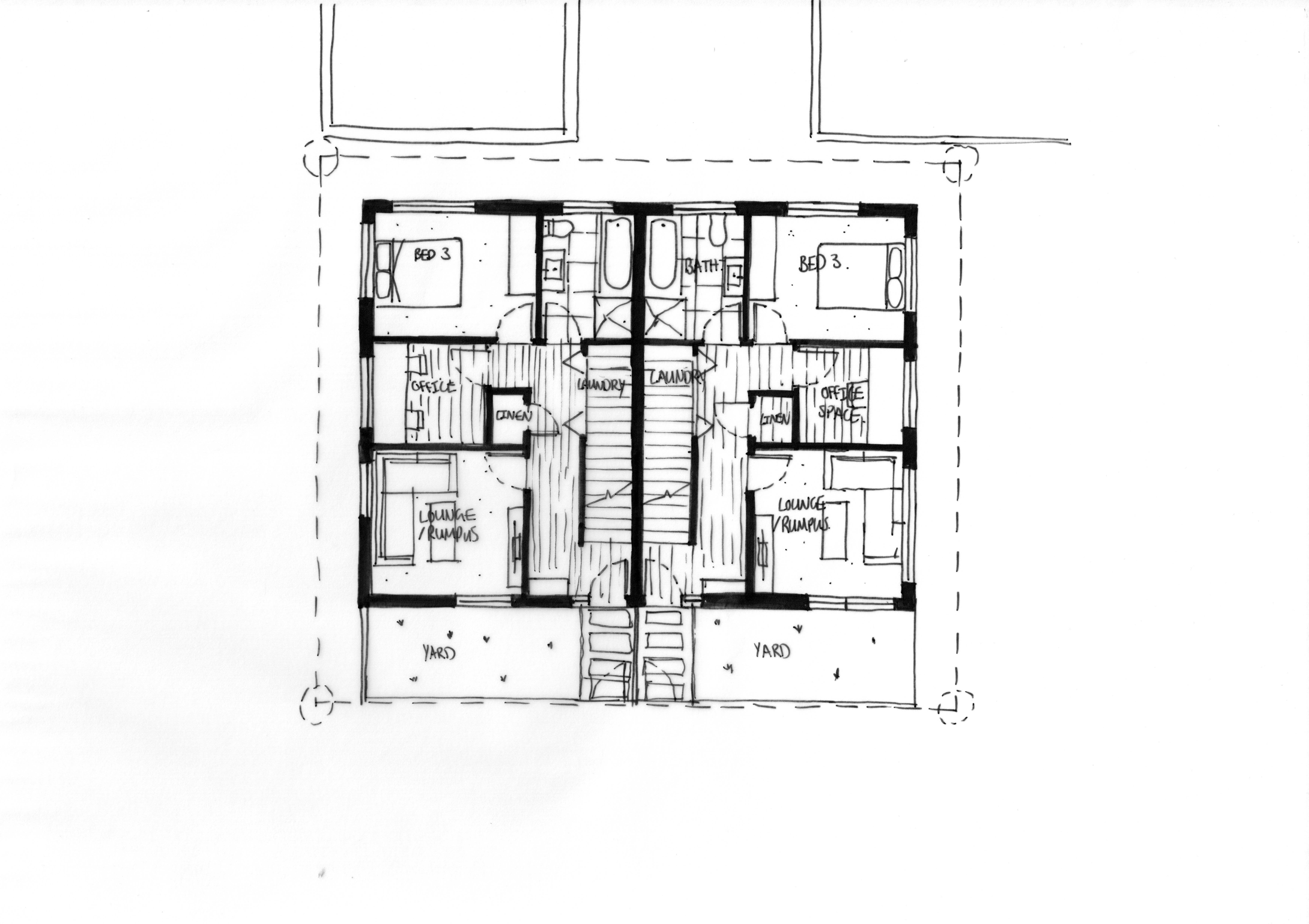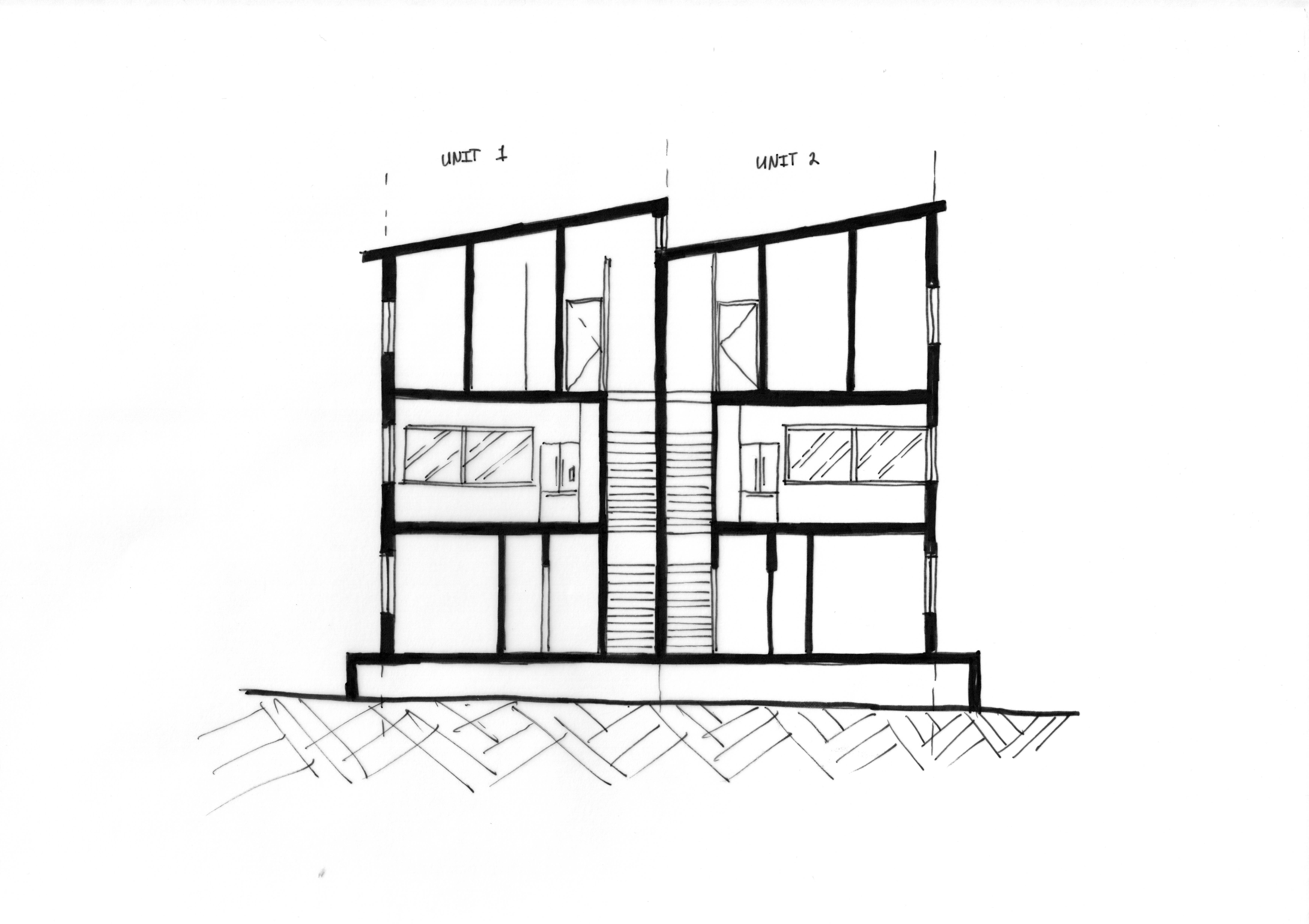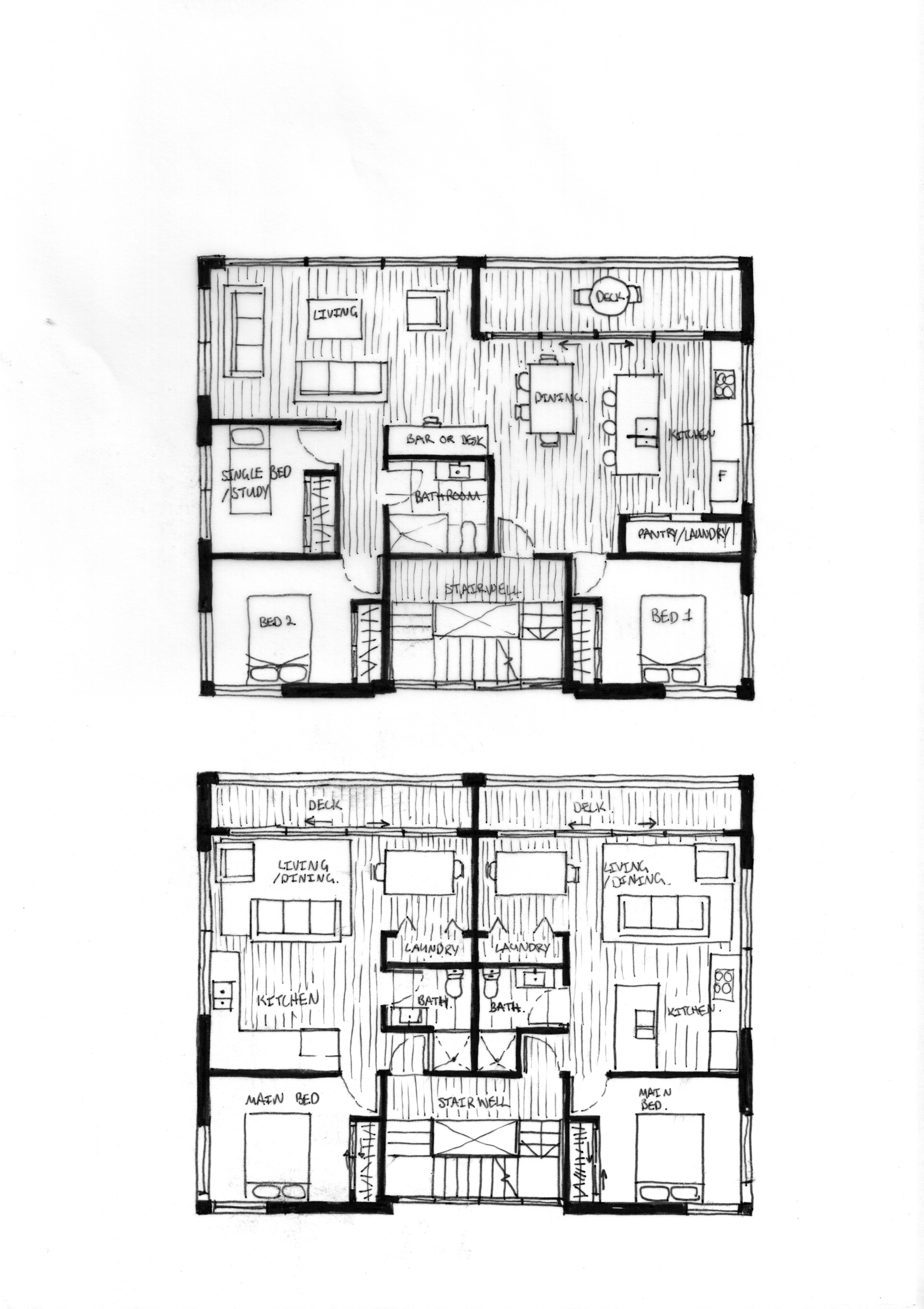 This concept is entirely residential with two large, three-bedroom units. It has bedrooms on the top and ground floor with the main living spaces on the middle floor.