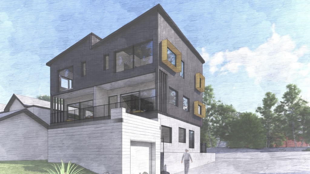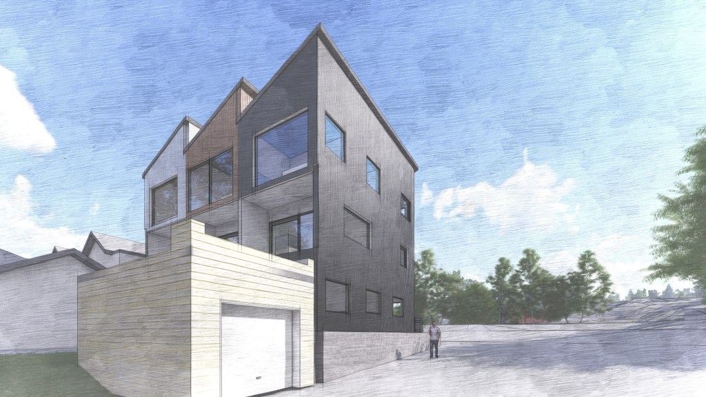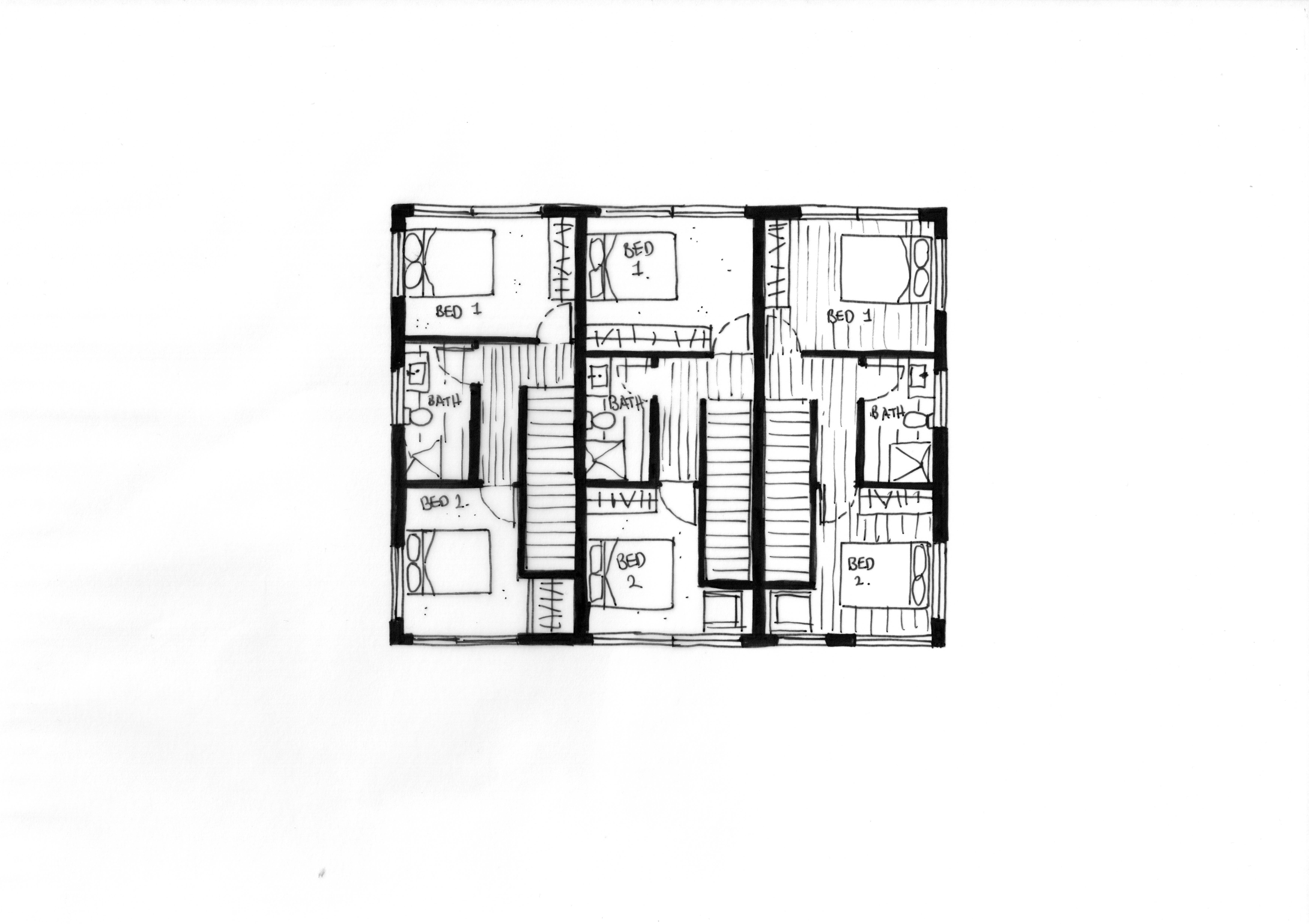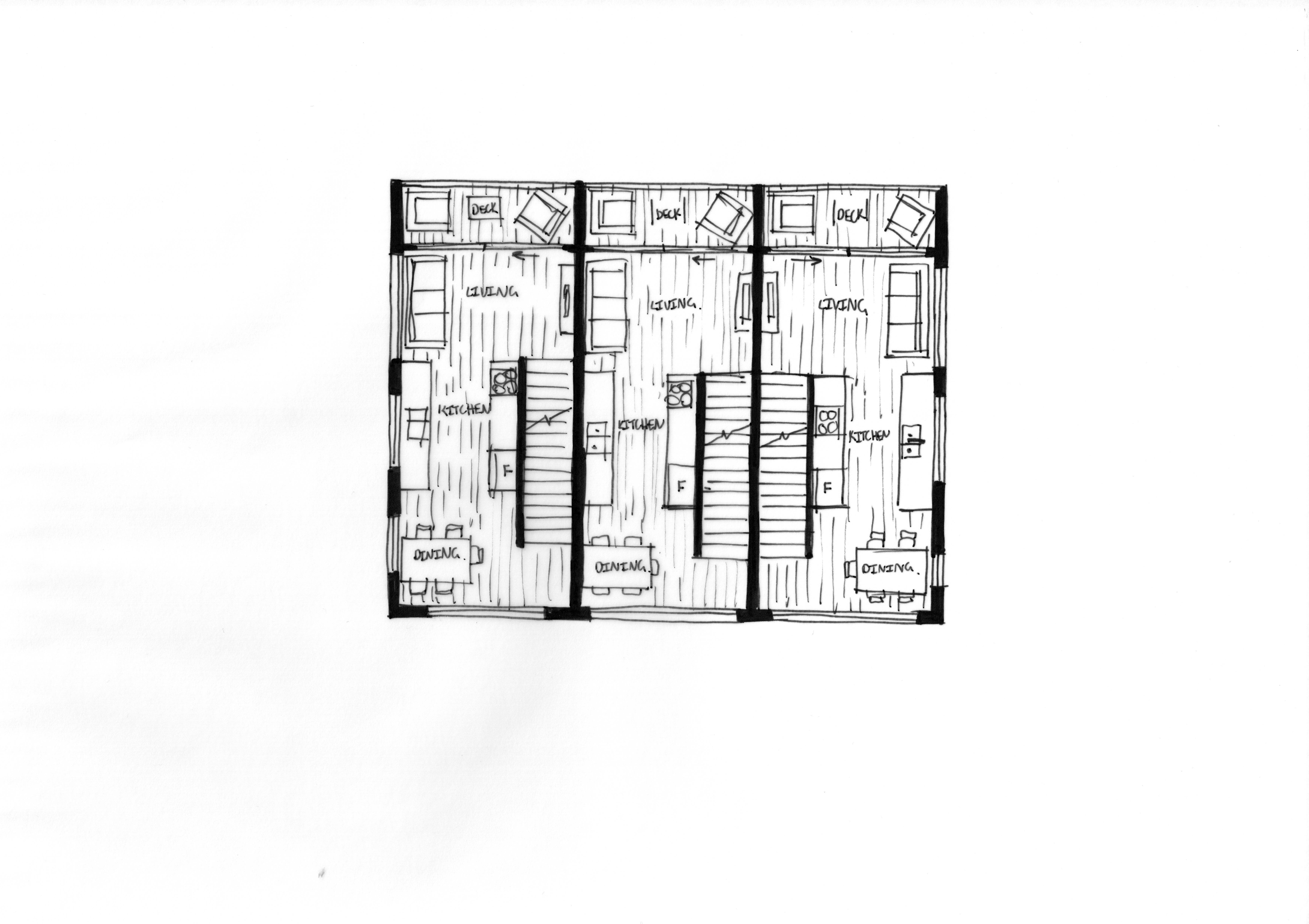 This concept is also entirely residential with three economical, three-bedroom units. It has bedrooms on the top and ground floor with the main living spaces on the middle floor.