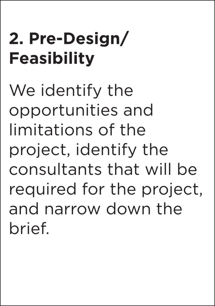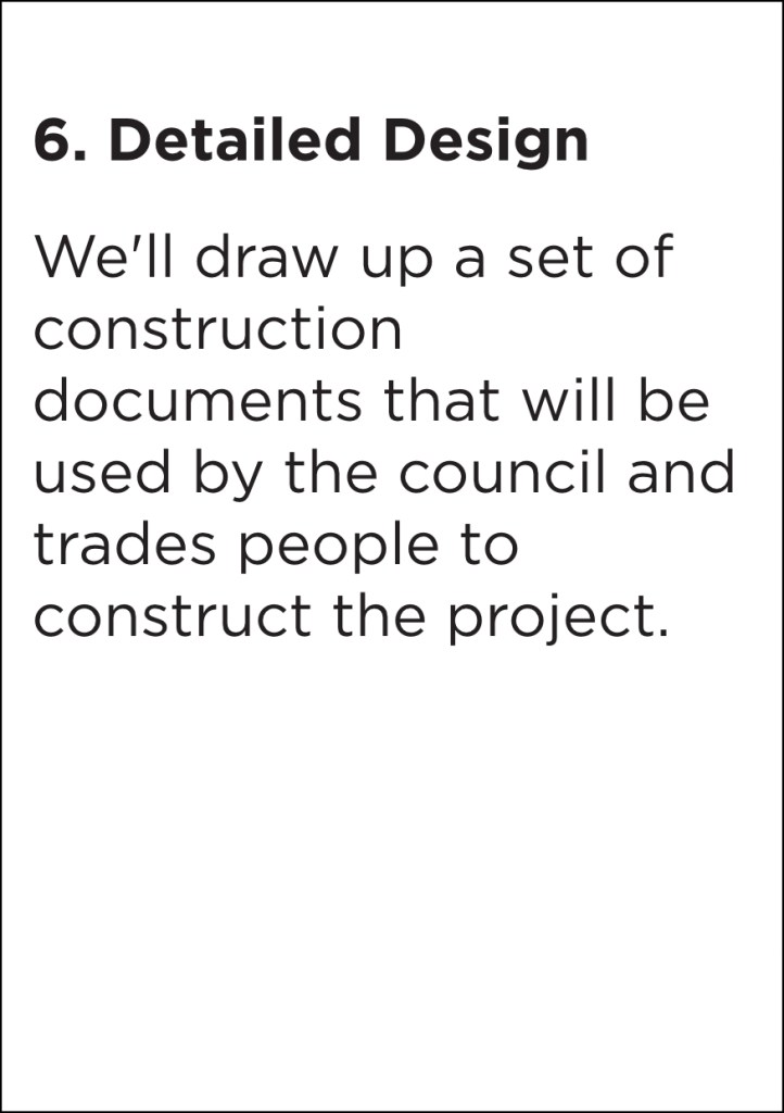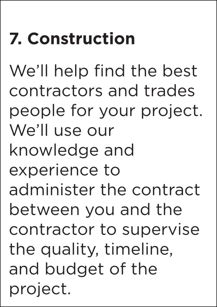 We can take your project from concept all the way through to project completion. Construction projects are complicated and we know our way around them. We have tried and tested consultants and trades people we work with who we trust and rely on. We’ll monitor the construction, advocate for you, and make sure you’re making informed decisions throughout the project.